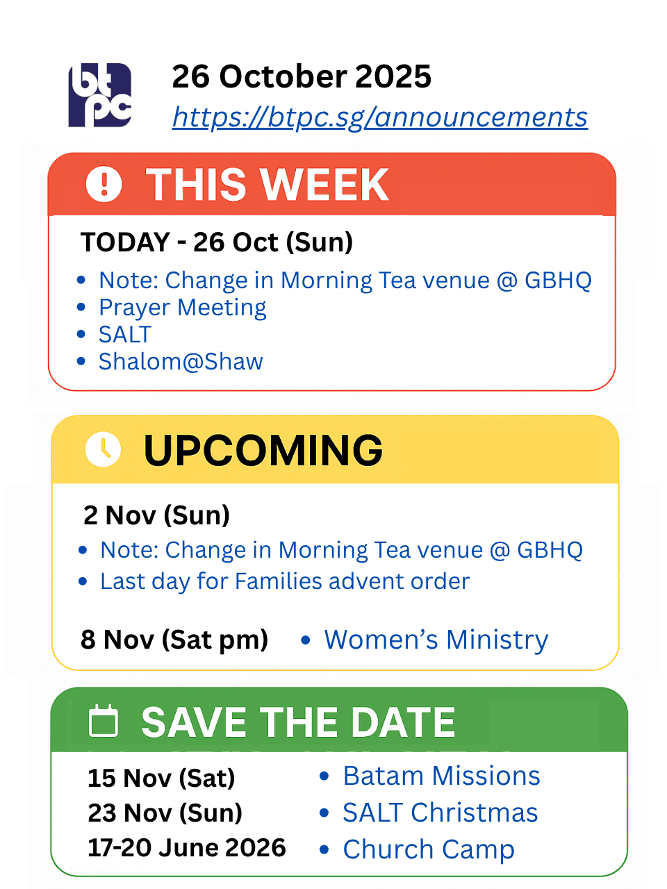 Morning tea for these 2 Sundays - 26 Oct & 2 Nov 2025 - will not be at the canteen.