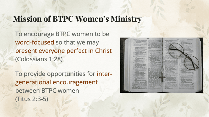 BTPC Women’s ministry seeks to gather the women of BTPC around God’s word to grow in love for Christ and eagerness to live for Him.